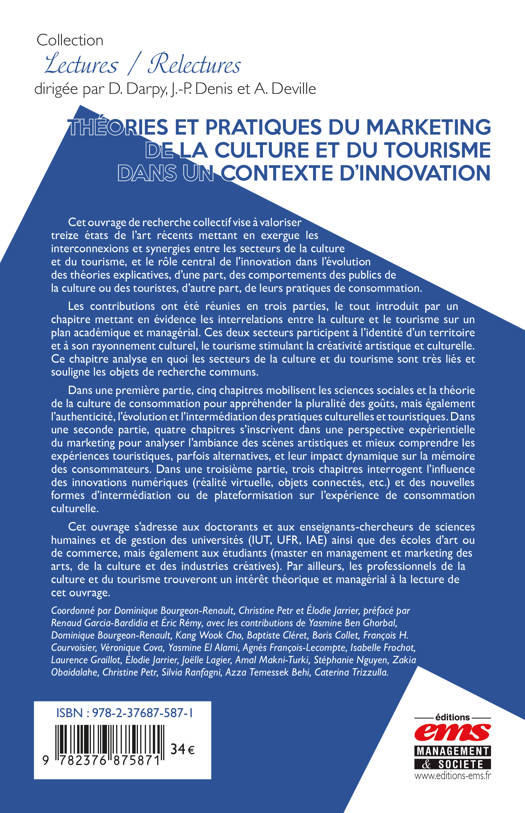 Un état des lieux de la théorisation du marketing de la culture et du tourisme dans des domaines tels que l'industrie musicale, le spectacle vivant ou encore l'économie collaborative, suivi d'une réflexion sur les pratiques liées à ce domaine ainsi que d'une exploration de ses usages alternatifs.