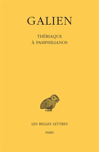 Medicament fetiche des empereurs romains, la theriaque, precieux antidote compose de tres nombreux et couteux ingredients dont l'opium et la chair de vipere, etait reputee efficace contre les venins et les poisons et supposee guerir toutes les maladies. Sa preparation complexe a donne lieu a une importante litterature ou les medecins grecs rivalisent de science et d'habilete pour adapter la fameuse recette mise au point par Andromaque, medecin de Neron. A cote du traite sur les Antidotes ou le grand medecin Galien de Pergame expose comment il obtint la charge de preparateur imperial de la theriaque sous Marc Aurele, le corpus galenique nous a conserve deux traites apocryphes consacres au celebre electuaire: apres la Theriaque a Pison parue dans la CUF en 2016, le petit traite sur la Theriaque a Pamphilianos vient donc completer cet ensemble consacre a cette preparation emblematique de la pharmacologie antique et dont la recette, transmise d'occident en orient et jusqu'en Chine, a continue d'etre preparee dans les officines jusqu'a la fin du XIXe siecle.