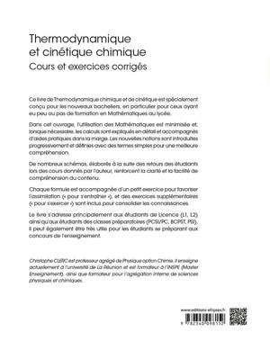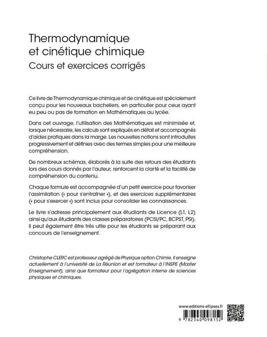Ce livre de Thermodynamique chimique et de cinétique est spécialement conçu pour les nouveaux bacheliers, en particulier pour ceux ayant eu peu ou pas de formation en Mathématiques au lycée.