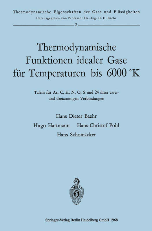Der hiermit vorgelegte zweite Band der Reihe "Thermo- dynamische Eigenschaften der Gase und F1Ussigkeiten" enthalt die thermodynamischen Funktionen von 30 Gasen im idealen Gas- zustand fUr Temperaturen bis zu 6000 oK. Diese Daten werden in Wissenschaft und Technik haufig und mit hoher Genauigkeit ben6tigt, so daB es uns angezeigt schien, eine Neuberechnung dieser Funktionen vorzunehmen, obwohl im auslandischen Schrift- tum ahnliche Zusammenstellungen existieren. Unseren Berechnungen ging ein eingehendes Studium und eine kritische Sichtung der ver6ffentlichten spektroskopischen Daten voraus, um die neuesten Angaben berUcksichtigen und die zuverlassigen Daten auswahlen zu k6nnen. Die fUr die Berec- nung der thermodynamischen Funktionen bekannten Beziehungen der statistischen Thermodynamik und der Quantenmechanik wurden ebenfalls kritisch geprUft und bei den zweiatomigen Gasen durch Weiterentwicklung der Berechnungsverfahren verbessert. Wir hoffen daher, daB die hier vorgelegten Zahlenangaben zu- verlassig sind und dem neuesten Stand der wissenschaftlichen Erkenntnis entsprechen. Die sehr umLangreichen numerischen Rechnungen wurden ausnahmslos mit elektronischen Datenverarbeitungsanlagen aus- gefGhrt. Die Tafeln im Tafelteil sind direkt vom Ausgabe-Loch- streifen der Rechenanlage ausgedruckt worden. Die so erhaltenen Ausgabeprotokolle sind auf photomechanischem Wege fUr den Druck benutzt worden, so daB keine Druckfehler im herk6mmlichen Sinne auftreten konnten.