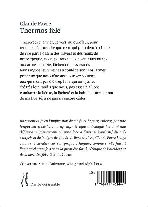 "Rarement ai-je eu l’impression de me faire happer, enlever, par une langue sacrificielle, un orage asymétrique et disloqué distillant une défiance religieusement chienne face à l’éternel impératif du pré-compris et de la ligne droite. Et de livre en livre, Claude Favre bouge comme le cavalier sur son propre échiquier, comme si elle faisait l’amour chaque fois pour la première fois à l’éthique de l’accident et de la dernière fois. " Benoît Jutras
