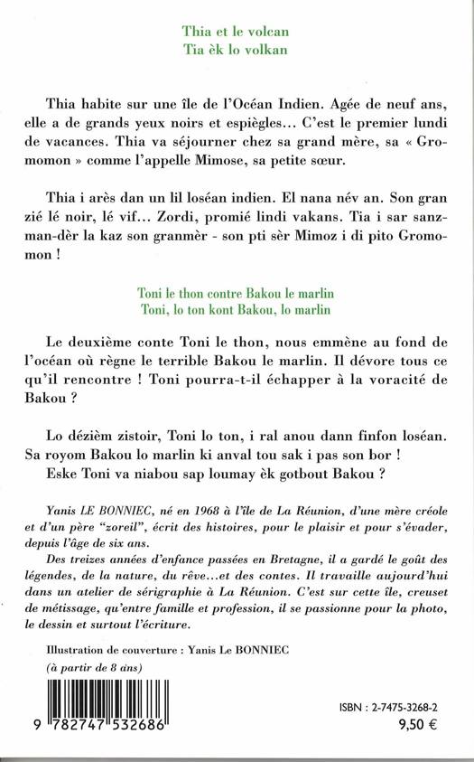 Thia habite sur une île de l'Océan Indien. Agée de neuf ans, elle a de grands yeux noirs et espiègles. C'est le premier lundi de vacances. Thia va séjourner chez sa grand-mère, sa "gro-momon" comme l'appelle Mimose, sa petite soeur . Le deuxième conte Toni le thon, nous emène au fond de l'océan où règne le terrible Bakou le marlin