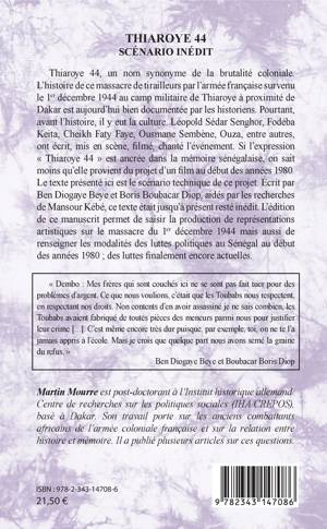 Le 1er décembre 1944 au camp militaire de Thiaroye à proximité de Dakar a lieu le massacre de tirailleurs par l'armée française. Si l'expression « Thiaroye 44 » est ancrée dans la mémoire sénégalaise, on sait moins qu'elle provient du projet d'un film au début des années 1980. Le texte présenté ici est le scénario technique de ce projet. Écrit par Ben Diogaye Beye et Boris Boubacar Diop, l'édition de ce manuscrit permet de saisir la production de représentations artistiques sur ce massacre mais aussi de renseigner les modalités des luttes politiques au Sénégal au début des années 1980 ; des luttes finalement encore actuelles.