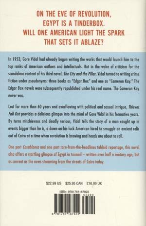 Thieves Fall Out provides a delicious glimpse into the mind of Gore Vidal in his formative years. By turns mischievous and deadly serious, Vidal tells the story of a man caught up in events bigger than he is, a down-on-his-luck American hired to smuggle an ancient relic out of Cairo at a time when revolution is brewing and heads are about to roll.