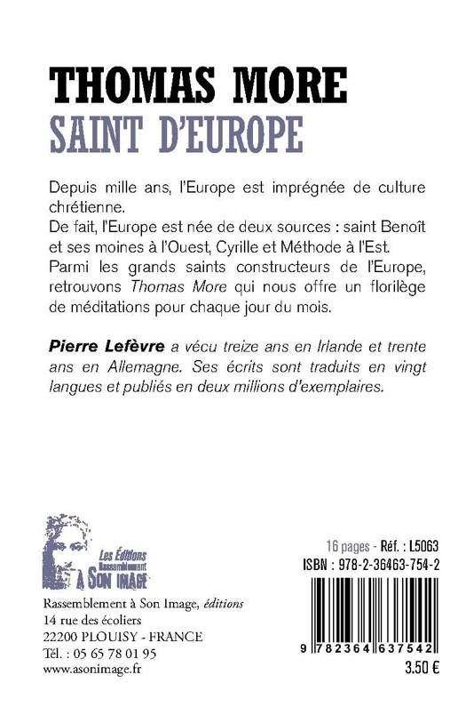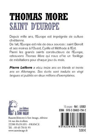Thomas More Saint d'Europe Depuis mille ans, l'Europe est imprégnée de culture chrétienne. De fait, l'Europe est née de deux sources : saint Benoît et ses moines à l'Ouest, Cyrille et Méthode à l'Est. Parmi les grands saints constructeurs de l'Europe, retrouvons Thomas More qui nous offre un florilège de méditations pour chaque jour du mois.