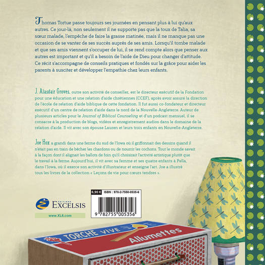 Thomas Tortue passe toujours ses journées en pensant plus à lui qu’aux autres. Ce jour-là, non seulement il ne supporte pas que la toux de Talia, sa soeur malade, l’empêche de faire la grasse matinée, mais il ne manque pas une occasion de se vanter de ses succès auprès de ses amis. Lorsqu’il tombe malade et que ses amis viennent s’occuper de lui, il se rend compte alors que penser aux autres est important et qu’il a besoin de l’aide de Dieu pour changer d’attitude. Ce récit s’accompagne de conseils pratiques et fondés sur la grâce pour aider les parents à susciter et développer l’empathie chez leurs enfants.
