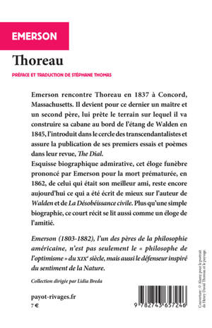 Emerson rencontre Thoreau en 1837 à Concord, Massachusetts. Il devient pour ce dernier un maître et un second père, lui prête le terrain sur lequel il va construire sa cabane au bord de l'étang de Walden en 1845, l'introduit dans le cercle des transcendantalistes et assure la publication de ses premiers essais et poèmes dans leur revue, « The Dial ». Esquisse biographique admirative, cet éloge funèbre prononcé par Emerson pour la mort prématurée, en 1862, de celui qui était son meilleur ami, reste encore aujourd'hui ce qui a été écrit de mieux sur l'auteur de « Walden » et de « La Désobéissance civile ». Plus qu'une simple biographie, ce court récit se lit aussi comme un éloge de l'amitié.