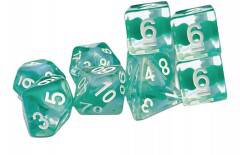 Inspired by the original Caverns of Thracia cover scheme, Thracian Azure Swirl Dice are made with special translucent resin, with a diffusion of color smoke in two tones, light blue and verdigris, with white ink. This set contains a d4, 3d6, d8, d10, d%, d12, and d20.