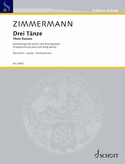 The pieces in Drei Tänze are part of a corpus of over 100 arrangements that Bernd Alois Zimmermann made for radio use, primarily for the NWDR. Now these delightful arrangements are also being made available for home and concert use. Instrumentation: 2 violins, viola, cello, double bass and piano