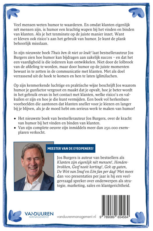 Thuis ben ik niet zo leuk! Klanten vinden en binden met een beetje humor Veel mensen weten humor te waarderen. En omdat klanten eigenlijk n?t mensen zijn, is humor een krachtig wapen bij het vinden en binden van klanten. Als je het tenminste op de juiste manier inzet. Want er kleven ook risico?s aan het gebruik van humor. Je kunt de plank behoorlijk misslaan. In zijn nieuwste boek Thuis ben ik niet zo leuk! laat bestsellerauteur Jos Burgers zien hoe humor kan bijdragen aan zakelijk succes ? en dat het een vaardigheid is die iedereen kan ontwikkelen. Niet door de lolbroek van de afdeling te worden, maar door humor op de juiste momenten bewust in te zetten in de communicatie met klanten. Met als doel verrassend uit de hoek te komen en hen te laten (glim)lachen. Op zijn kenmerkende luchtige en praktische wijze beschrijft Jos Burgers waarom humor je gunfactor vergroot en maakt dat je opvalt, hoe je beter wordt in het gebruik ervan in het contact met klanten, welke risico?s en valkuilen er zijn en hoe je die kunt vermijden. Een boek vol herkenbare voorbeelden die aantonen dat klanten sneller voor je kiezen en langer bij je blijven, als je de moed hebt om serieus werk te maken van humor! * Het nieuwste boek van bestsellerauteur Jos Burgers, over de kracht van humor bij het vinden en binden van klanten. * Van zijn complete oeuvre zijn inmiddels meer dan 200.000 exemplaren verkocht. Over de auteur Jos Burgers is auteur van bestsellers als Klanten zijn eigenlijk n?t mensen!, Hondenbrokken, Geef nooit korting!, Gek op gaten, De Wet van Snuf en E?n fan per dag! Met meer dan 100 presentaties per jaar is hij een veelgevraagd spreker over onderwerpen als strategie, marketing, sales en klantgerichtheid. [quote] Meester van de eyeopeners! Uitvoering: gebonden Omvang: 160 pagina?s Auteur: Burgers Formaat: 14 x 21 cm ISBN: 9789089654564 E-boek: 9789089654571 NUR: 801 Thema: KJB Prijs: 20,00 Verschijnt: januari 2020