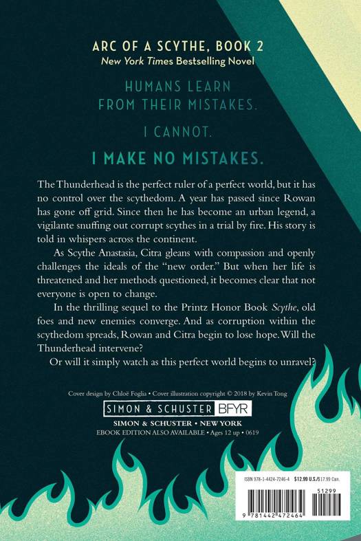 "Intelligent and entertaining." --Kirkus Reviews (starred review) "Even better than the first book." --School Library Journal (starred review) Rowan and Citra take opposite stances on the morality of the Scythedom, putting them at odds, in the chilling sequel to the Printz Honor Book Scythe from New York Times bestseller Neal Shusterman, author of the Unwind dystology. Humans learn from their mistakes. I cannot. I make no mistakes. The Thunderhead is the perfect ruler of a perfect world, but it has no control over the scythedom. A year has passed since Rowan had gone off grid. Since then, he has become an urban legend, a vigilante snuffing out corrupt scythes in a trial by fire. His story is told in whispers across the continent.