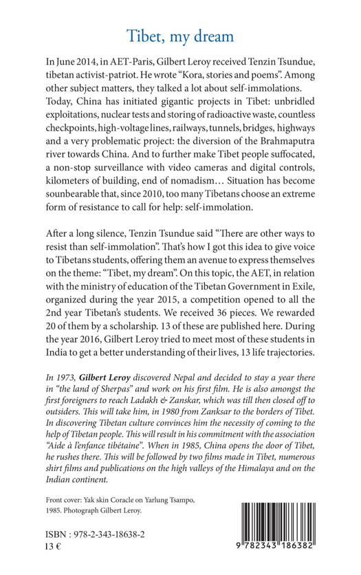 After a long silence, Tenzin Tsundue said « There are other ways to resist than self-immolation ». That's how I got this idea to give voice to Tibetans students, offering them an avenue to express themselves on the theme : « Tibet, my dream ». On this topic, the AET, in relation with the ministry of education of the Tibetan Government in Exile, organized during the year 2015, a competition opened to all the 2nd year Tibetans students. We received 36 pieces. We rewarded 20 of them by a scholarship. 13 of these are published here. During the year 2016, Gilbert Leroy tried to meet most of these students in India to get a better understanding of their lives, 13 life trajectories.