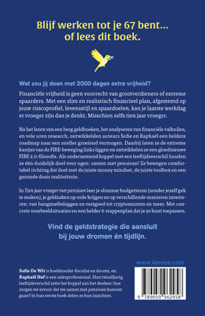 Wat zou jij doen met 2000 dagen extra vrijheid? Financiële vrijheid is geen voorrecht van grootverdieners of extreme spaarders. Met een slim en realistisch financieel plan, afgestemd op jouw risicoprofiel, levensstijl en spaardoelen, kan je laatste werkdag er vroeger zijn dan je denkt. Misschien zelfs tien jaar vroeger. Na het lezen van een berg geldboeken, het analyseren van financiële valkuilen, en vele uren research, ontwikkelden auteurs Sofie en Raphaël een heldere roadmap naar een sneller groeiend vermogen. Daarbij laten ze de extreme kantjes van de FIRE-beweging links liggen en ontwikkelen ze een gloednieuwe FIRE 2.0-filosofie. Als ondernemend koppel met een leeftijdsverschil houden ze één duidelijk doel voor ogen: samen met pensioen! Ze bewegen comfortabel richting dat doel met de juiste money mindset, de juiste toolbox en een gezonde dosis realiteitszin. In Tien jaar vroeger met pensioen leer je slimmer budgetteren (zonder jezelf gek te maken), je geldzaken op orde krijgen en op verschillende manieren investeren: van hangmatbeleggen en vastgoed tot cryptomunten en meer. Met concrete voorbeeldsituaties en een helder 6-stappenplan dat je zo kunt toepassen. Vind de geldstrategie die aansluit bij jouw dromen én tijdlijn.