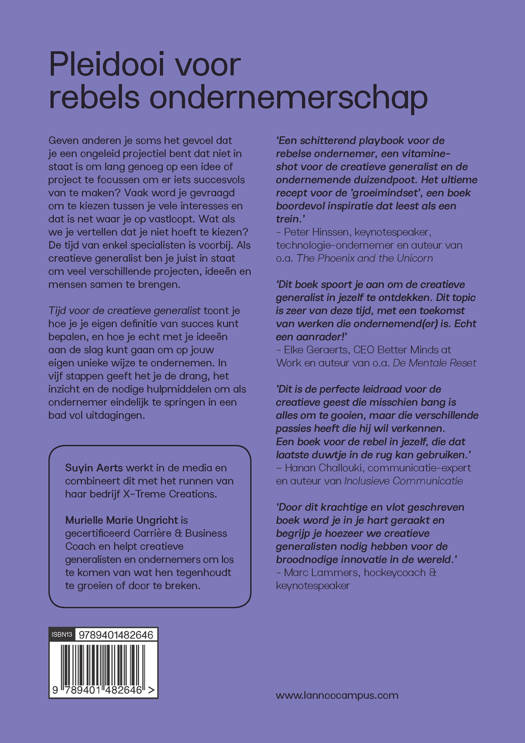 Tijd voor de creatieve generalist! toont je hoe je je eigen definitie van succes kunt bepalen, en hoe je echt met je ideeën aan de slag kunt gaan om op jouw eigen unieke wijze te ondernemen. In vijf stappen geeft het je de drang, het inzicht en de nodige hulpmiddelen om als ondernemer eindelijk te springen in een bad vol uitdagingen.