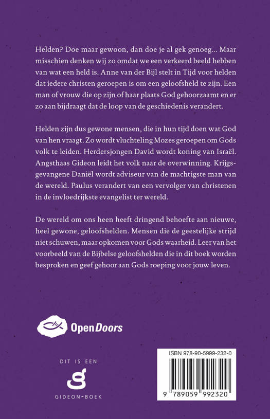 Helden? Doe maar gewoon, dan doe je al gek genoeg... Maar misschien denken wij zo omdat we een verkeerd beeld hebben van wat een held is. Anne van der Bijl stelt in Tijd voor helden dat iedere christen geroepen is om een geloofsheld te zijn. Een man of vrouw die op zijn of haar plaats God gehoorzaamt en er zo aan bijdraagt dat de loop van de geschiedenis verandert. Helden zijn dus gewone mensen, die in hun tijd doen wat God van hen vraagt. Zo wordt vluchteling Mozes geroepen om Gods volk te leiden. Herdersjongen David wordt koning van Israël. Angsthaas Gideon leidt het volk naar de overwinning. Krijgsgevangene Daniël wordt adviseur van de machtigste man van de wereld. Paulus verandert van een vervolger van christenen in de invloedrijkste evangelist ter wereld. De wereld om ons heen heeft dringend behoefte aan nieuwe, heel gewone, geloofshelden. Mensen die de geestelijke strijd niet schuwen, maar opkomen voor Gods waarheid. Leer van het voorbeeld van de Bijbelse geloofshelden die in dit boek worden besproken en geef gehoor aan Gods roeping voor jouw leven.