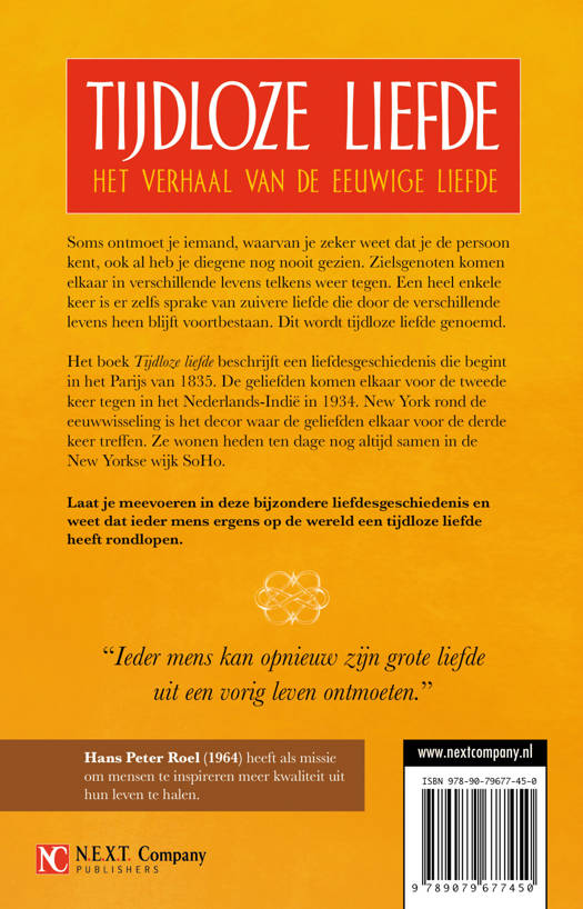 Het boek "Tijdloze liefde" beschrijft een liefdesgeschiedenis die begint in het Parijs van 1835. De geliefden komen elkaar voor de tweede keer tegen in het Nederland-Indie in 1934. New York rond de eeuwwisseling is het decor waar de geliefden elkaar voor de derde keer treffen. Ze wonen heden ten dage nog altijd samen in de wijk New Yorkse wijk SoHo.