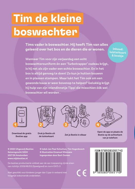 Wanneer Tim voor zijn verjaardag een echt boswachtersuniform én een ‘Turbotrapper’ cadeau krijgt, is hij net als zijn vader een echte boswachter. En in het bos is altijd genoeg te doen! Zo kun je hutten bouwen en in plassen stampen. Maar lukt het Tim ook om een gewonde kauw er weer bovenop te helpen? Gelukkig krijgt hij hulp van zijn vriendinnetje Tippi die misschien óók wel boswachter wil worden.