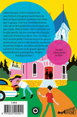 J'adorerais que ce livre raconte la vie sans histoire d'un garçon vautré dans un fauteuil façon fainéant professionnel. Parce que ce garçon, c'est moi, Timothée Brahms, celui qui ne demandait rien à la vie à part une paix royale. Mais le destin adore s'acharner sur les plus gentils, les plus intelligents et les plus innocents d'entre nous (donc moi). Du coup, ce livre raconte plutôt l'histoire dingo d'un garçon persécuté par une horrible destinée constituée de parents indignes, de robots mal fichés, de mystères à résoudre et de grands-parents potentiellement psychopathes. Misère, POURQUOI MOI ?