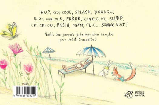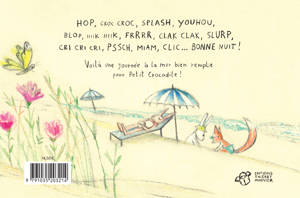 Les vagues font «splash», les mouettes font «iiik iiik», le château de sable fait «tap tap», la crème solaire fait «splotch», les poissons qui font «blob blob», et la montre «tic-tac» annonce que c'est déjà l'heure de rentrer... mais tant mieux ! Après la douche «pchii»,c'est l'heure des brochettes cuites au barbecue au son des grillons «cri cri cri» puis d'observer les étoiles avant de se coucher sous la tente. Bonne nuit ! Un livre drôle et tout en tendresse pour accompagner les premiers moments à la mer.
