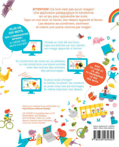 Attention ! Ce livre n'est pas qu'un imagier ! Une application pédagogique le transforme en un jeu pour apprendre les mots. Tape un mot avec le clavier, son dessin apparaît à l'écran. Les dessins se combinent, s'animent et créent une scène comme par magie ! « (écran 1)» Choisis un mot de ton livre, tape les lettres sur ton clavier... son image apparaît à l'écran «(écran 2)» En combinant les mots qui te plaisent, tu vas construire une scène animée avec des arbres, des animaux, des personnages... «(écran 3) »Tu peux aussi changer la météo, la saison, les couleurs... et jouer avec tes personnages. Et même imprimer ton dessin.