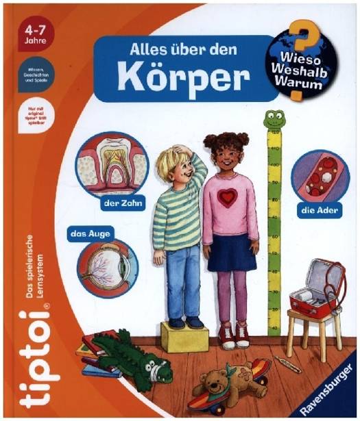 Toll, was unser Körper kann! Welches sind die kleinsten und größten Knochen des Körpers? Warum schwitze oder friere ich? Und was tut dem Körper gut? In diesem Buch erfahren Kinder allerhand Wissenswertes über die verschiedenen Bestandteile des menschlichen Körpers. Anhand von Szenen aus dem Kinderalltag erklärt tiptoi den kleinen Entdeckern, wie ihr Körper funktioniert: Beim Seifenblasenpusten ist die Lunge im Einsatz, nach der Wasserschlacht haben die Kinder Gänsehaut und auf dem Klettergerüst sind Muskeln gefragt.