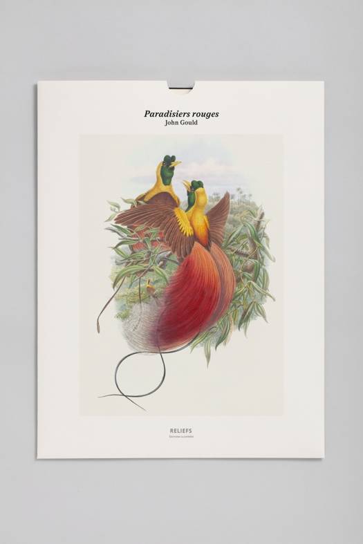 Ce dessin réalisé par John Gould est issu d'un ouvrage colossal en cinq volumes dédié à la spectaculaire diversité ornithologique de la Nouvelle-Guinée et des îles environnantes. Laissé inachevé à sa mort en 1881, il a été complété par Richard Bowdler Sharpe, son litographe et ami dévoué. Chacune des 320 planches de The Birds of New Guinea and the adjacent Papuan Islands donne à admirer la beauté des formes et le plumage chatoyant des oiseaux dans une bulle d'environnement naturel. Le mâle et la femelle représentés ici sont des paradisiers rouges (Paradisea sanguinea) vivant à Waigiou, Ghemien et Batanta, dans l'archipel des Raja Ampa, aujourd'hui en Papouasie occidentale. À la fois puissante et légère, l'image se distingue par la masse de plumes d'un rouge profond qui jaillit sous les ailes du mâle au premier plan. De l'arrière du dos descendent deux longues hampes, noires et torsadées, qui tombent de chaque côté de la queue en formant d'élégantes courbes.