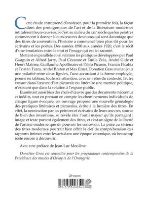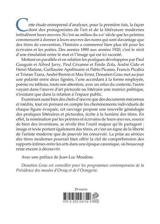 Cette etude entreprend d'analyser, pour la premiere fois, la facon dont des protagonistes de l'art et de la litterature modernes intitulerent leurs oeuvres. Si c'est au milieu du XIXe siecle que les peintres commencent a donner a leurs oeuvres des noms qui sont davantage que des titres de convention, l'histoire a commence bien plus tot pour les ecrivains et les poetes. Des annees 1890 aux annees 1920, c'est le recit d'une emulation entre le mot et l'image qui est ici raconte. Mettant en parallele et en relation les pratiques developpees par Paul Gauguin et Alfred Jarry, Paul Cezanne et Emile Zola, Andre Gide et Henri Matisse, Guillaume Apollinaire et Pablo Picasso, Francis Picabia et Tristan Tzara, Andre Breton et Max Ernst, Donatien Grau met au jour une polarite entre deux lignees, l'une accordant a la forme employee, poeme ou tableau, toute son attention, avec un refus du contexte, l'autre voyant dans l'oeuvre d'art picturale ou litteraire une matrice politique, n'existant que dans la relation a l'espace public. Examinant aussi bien des chefs-d'oeuvre que des documents meconnus et inedits, tout en prenant en compte les cheminements individuels de chaque figure evoquee, cet ouvrage propose une nouvelle genealogie des pratiques litteraires et picturales, ecrite a la lumiere des titres. En effet, la nomination par les peintres et ecrivains de leurs oeuvres, source de bien des inventions, se revele etre l'outil majeur qu'ils partagent: image et texte portent egalement des titres, et c'est un signe de la liberte de l'artiste moderne que de pouvoir les concevoir. La prise au serieux des titres modernes pourrait bien offrir la clef de comprehension des rapports intimes entre les arts dans une epoque canonique, ou beaucoup reste encore a decouvrir.