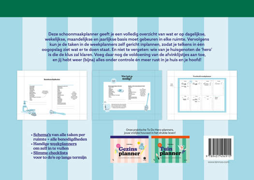 Deze schoonmaakplanner geeft je een volledig overzicht van wat er op dagelijkse, wekelijkse, maandelijkse en jaarlijkse basis moet gebeuren in elke ruimte. Vervolgens kun je de taken in de weekplanners zelf gericht inplannen, zodat je telkens in één oogopslag ziet wat er te doen staat. En niet te vergeten: wie van je huisgenoten de 'hero' is die de klus zal klaren. Voeg daar nog de voldoening van de afvinklijstjes aan toe, en jij hebt weer (bijna) alles onder controle én meer rust in je huis en je hoofd!