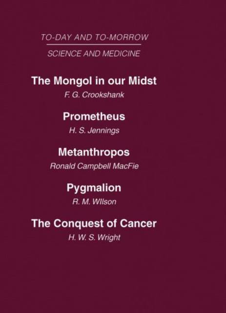 Today and Tomorrow Volume 10 Science and Medicine reprints The Mongol in Our Midst, Prometheus or Biology and the Advancement of Man, Metanthropos or the Body of the Future, Pygmalion or the Doctor of the Future, and The Conquest of Cancer. Very much products of their time, these books provide a lucid picture of the advances in science of the early twentieth century.