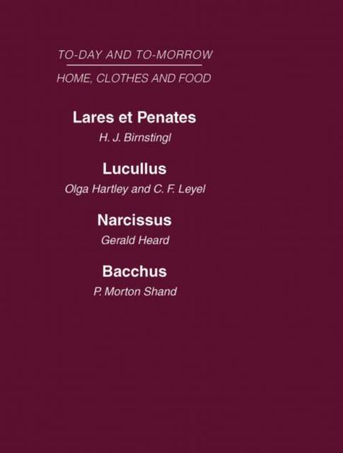 Today and Tomorrow Volume 5 Home, Clothes and Food reprints Lares et Penates, or the Home of the Future by H J Birnstingl, Lucullus, or the Food of the Future by Olgar Hartley and C F Leyel, Narcissus, an Anatomy of Clothes by Gerald Heard and Bacchus or wine to-day and to-morrow by P Morton Shand. These volumes, originally published in the 1920s discuss the challenges of feeding a growing world population, social and political issues surrounding alcohold consumption, and "modern" domestic labour-saving devices.