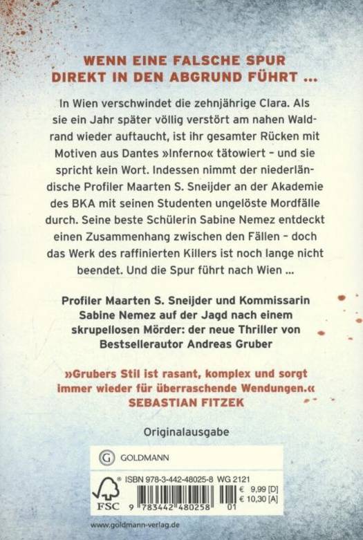 In Wien verschwindet die zehnjährige Clara. Ein Jahr später taucht sie völlig verstört am nahen Waldrand wieder auf. Ihr gesamter Rücken ist mit Motiven aus Dantes "Inferno" tätowiert - und sie spricht kein Wort. Indessen nimmt der niederländische Profiler Maarten S. Sneijder an der Akademie des BKA für hochbegabten Nachwuchs mit seinen Studenten ungelöste Mordfälle durch. Seine beste Schülerin Sabine Nemez entdeckt einen Zusammenhang zwischen mehreren Fällen - aber das Werk des raffinierten Killers ist noch lange nicht beendet. Seine Spur führt nach Wien - wo Clara die einzige ist, die den Mörder je zu Gesicht bekommen hat ... Der zweite Fall für Sneijder und Nemez.