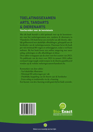 Met het boek 'toelatingsexamen arts, tandarts en dierenarts' bereidt u zich optimaal voor op de kennistoetsen voor het toelatingsexamen arts, tandarts & dierenarts in Vlaanderen. Dit boek bevat een overzicht van alle theorie, rijkelijk geïllustreerd met duidelijke afbeeldingen, gekoppeld aan de leerdoelen van de toelatingsexamens. Daarnaast bevat dit boek per vak minimaal 80 vragen oefenopgaven, zodat u veel kunt oefenen. Bij het boek hoort een online omgeving met meer uitleg en oefeningen en alle afbeeldingen in kleur. Deze editie is toegepast aan de eisen voor het examen van 2023. Na publicatie van de eisen voor 2024 in januari 2024 zullen eventueel toegevoegde onderwerpen in de theorie gepubliceerd worden op de website toelatingsexamenvlaanderen.be.