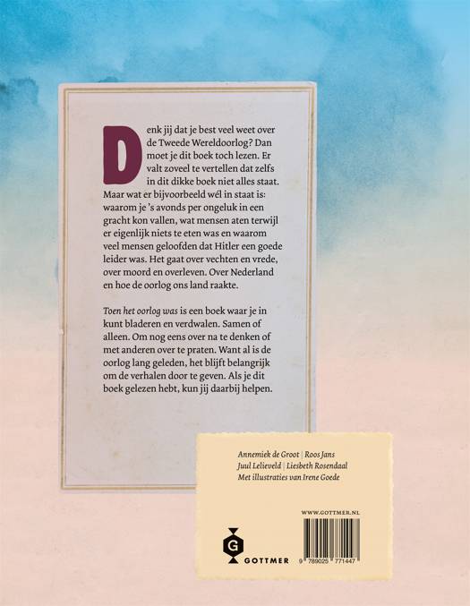 'Toen het oorlog was, 1939-1945' is een verzorgd overzichtswerk voor kinderen vanaf 10 jaar die meer willen weten over de Tweede Wereldoorlog. Het staat vol indrukwekkende historische foto's, en illustrator Irene Goede maakte de sfeervolle illustraties, die de soms indringende tekst verluchtigen en een extra dimensie geven aan de historische beelden. Het boek won in 2020 een Zilveren Griffel.