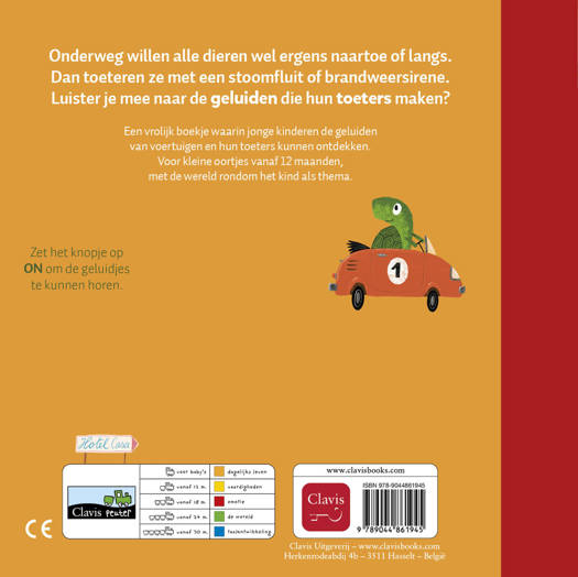 Een vrolijk boekje waarin jonge kinderen de geluiden van voertuigen en hun toeters kunnen ontdekken. Voor kleine oortjes vanaf 12 maanden, met de wereld rondom het kind als thema.