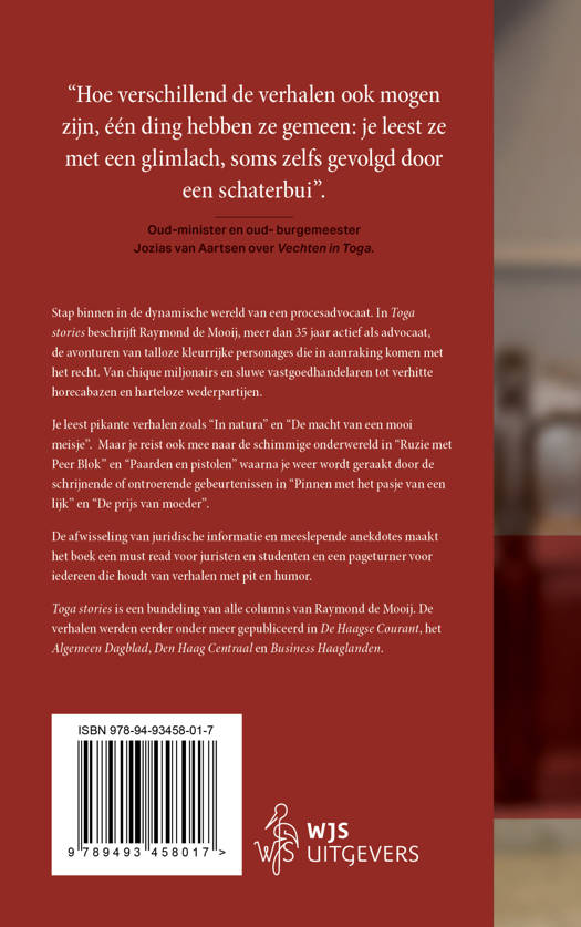 Stap binnen in de dynamische wereld van een procesadvocaat. In Toga stories beschrijft Raymond de Mooij, meer dan 35 jaar actief als advocaat, de avonturen van talloze kleurrijke personages die in aanraking komen met het recht. Van chique miljonairs en sluwe vastgoedhandelaren tot verhitte horecabazen en harteloze wederpartijen. Je leest pikante verhalen zoals “In natura” en “De macht van een mooi meisje”. Maar je reist ook mee naar de schimmige onderwereld in “Ruzie met Peer Blok” en “Paarden en pistolen” waarna je weer wordt geraakt door de schrijnende of ontroerende gebeurtenissen in “Pinnen met het pasje van een lijk” en “De prijs van moeder”. De afwisseling van juridische informatie en meeslepende anekdotes maakt het boek een must read voor juristen en studenten en een pageturner voor iedereen die houdt van verhalen met pit en humor. Toga stories is een bundeling van alle columns van Raymond de Mooij. De verhalen werden eerder onder meer gepubliceerd in De Haagse Courant, het Algemeen Dagblad, Den Haag Centraal en Business Haaglanden.