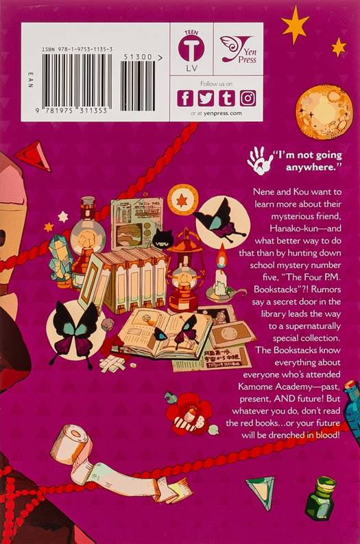 "I'm not going anywhere." Nene and Kou want to learn more about their mysterious friend, Hanako-kun--and what better way to do that than by hunting down school mystery number five, "The Four P.M. Bookstacks"?! Rumors say a secret door in the library leads the way to a supernaturally special collection. The Bookstacks know everything about everyone who's attended Kamome Academy--past, present, AND future! But whatever you do, don't read the red books...or your future will be drenched in blood!