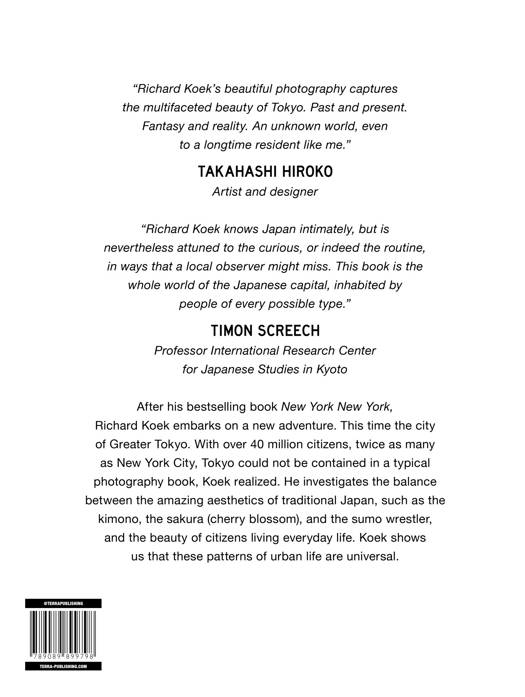 A photo book about Tokyo, where not only neon and plastic, but also traditional kimonos and cherry blossoms, fashion and advertising are as important as etiquette and tidiness. A unique book by photographer Richard Koek about one of the world's largest cities, Tokyo. The visitor of this megapolis in Japan will see a lot of neon and plastic, but also traditional kimonos and cherry blossoms. Fashion and advertising are at least as important as etiquette and tidiness. In