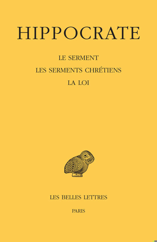 Le Serment d'Hippocrate est l'oeuvre la plus celebre de la Collection Hippocratique avec les Aphorismes. Depuis la Renaissance, le Serment est publie en tete de l'ensemble de la soixantaine de traites attribues a Hippocrate (ne a Cos en 460). C'est le serment jure par le disciple pour garantir le contrat qui le lie a son maitre lorsqu'il entre des l'enfance dans l'ecole medicale ou il aura le privilege de recevoir un enseignement moyennant salaire. Ce serment est ne dans un contexte historique precis, celui de la grande famille medicale des Asclepiades qui pretendait descendre d'Asclepios, le dieu de la medecine, a laquelle appartient Hippocrate. La medecine s'y transmettait de pere en fils. Mais la famille decida de s'ouvrir a des disciples exterieurs a la famille. Cette ouverture s'est faite a l'epoque d'Hippocrate, dont on sait, par le Protagoras de Platon (311 b) qu'il enseignait la medecine moyennant salaire. Le Serment doit sa celebrite perenne aux exigences deontologiques et morales auxquelles le futur medecin doit se conformer: veiller a l'utilite du malade, ne donner ni poison ni abortif, conserver une conduite irreprochable lors de la visite des malades et respecter le secret medical. L'actualite du Serment n'est pas a demontrer: le Conseil National de l'Ordre des medecins possede sur son site une version actualisee du Serment d'Hippocrate. Ce Serment paien a ete conserve et amenage dans le milieu chretien. On possede un Serment chretien en prose et un autre en vers. Au Serment est joint le traite de la Loi qui forme couple avec lui depuis l'Antiquite. Moins celebre, ce petit traite ne manque pas d'interet et de charme, car il a pour objet de definir les meilleures conditions de l'enseignement d'une veritable medecine a l'heure ou, dans une profession qui n'etait pas reglementee, les charlatans sont plus nombreux que les veritables medecins. Ces trois Serments et la Loi font l'objet d'une nouvelle edition critique qui prend en compte pour la premiere fois non seulement la totalite des manuscrits grecs, mais aussi la tradition papyrologique et les traductions arabe et latine. Le commentaire critique utilise en particulier les documents epigraphique et papyrologique pour montrer ce qu'il y a de traditionnel et d'original dans la redaction du Serment medical.