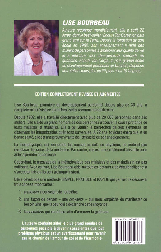 Lise Bourbeau, pionnière du développement personnel depuis près de 30 ans a complètement réédité ce grand best-seller reconnu mondialement. La première édition s'est vendue à plus de 460 000 exemplaires et a été traduite en 14 langues. Depuis, elle a réalisé que le message métaphysique des malaises et des maladies n'était pas suffisant. Elle devait aider les gens à se déculpabiliser et surtout, à s'accepter tels qu'ils sont à chaque instant. Elle a développé une méthode SIMPLE, PRATIQUE et RAPIDE qui aide à découvrir trois choses importantes sur soi : le besoin inconscient de notre être ; la façon de penser (une croyance) qui nous empêche de manifester ce besoin ainsi que la peur qui a déclenché cette croyance ; ce que nous devons accepter afin d'amorcer la guérison. Ce livre vous permettra de vous aimer tel que vous êtes ! Remplace EAN 9782920932159.