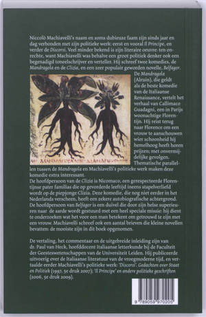 Niccolò Machiavelli’s naam en soms dubieuze faam zijn sinds jaar en dag verbonden met zijn politieke werk: eerst en vooral Il Principe, en verder de Discorsi. Veel minder bekend is zijn literaire oeuvre: ten onrechte, want Machiavelli was behalve een groot politiek denker ook een begenadigd toneelschrijver en verteller. Hij schreef twee komedies, de Mandragola en de Clizia, en een zeer populair geworden novelle, Belfagor. De Mandragola (Alruin), die geldt als de beste komedie van de Italiaanse Renaissance, vertelt het verhaal van Callimaco Guadagni, een in Parijs woonachtige Florentijn. Hij reist terug naar Florence om een vrouw te aanschouwen wier schoonheid hij hemelhoog heeft horen prijzen; met onvermijdelijke gevolgen. Thematische parallellen tussen de Mandragola en Machiavelli’s politieke werk maken deze komedie extra interessant. De hoofdpersoon van de Clizia is Nicomaco, een gerespecteerde Florentijnse pater familias die op gevorderde leeftijd ineens stapelverliefd wordt op de piepjonge Clizia. Deze komedie, die nog niet eerder in het Nederlands verscheen, heeft een zekere autobiografische achtergrond. De hoofdpersoon van Belfagor is een duivel die door zijn helse superieuren naar de aarde wordt gestuurd met een heel speciale missie: hij dient te onderzoeken wat het voor een man betekent om getrouwd te zijn met een vrouw. Machiavelli schreef ook een aantal brieven die kleine novellen bevatten: de mooiste zijn in dit boek opgenomen. De vertaling, het commentaar en de uitgebreide inleiding zijn van dr. Paul van Heck, hoofddocent Italiaanse letterkunde bij de Faculteit der Geesteswetenschappen van de Universiteit Leiden. Hij publiceerde uitvoerig over de Italiaanse literatuur van de vroegmoderne tijd, en vertaalde eerder Machiavelli’s politieke werk: ‘Discorsi’. Gedachten over Staat en Politiek (1997, 5e druk 2007); ‘Il Principe’ en andere politieke geschriften (2006, 5e druk 2009).