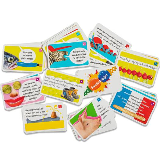 Tongbrekers – de ultieme uitdaging voor jong en oud! Herken je klassiekers als “Leentje leerde Lotje lopen”? In dit vrolijke spel vind je ook nieuwe tongtwisters zoals “Ruud Rups rap rode radijsjes raspt”. Lach, struikel, oefen en win met deze stuiterzinnen. Tongbrekers verbetert je articulatie, traint je geheugen én zorgt voor dikke pret. Perfect voor thuis, school of logopedie. Durf jij de uitdaging aan?