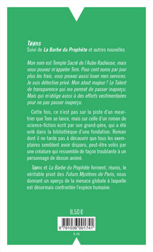 Mon nom est Temple Sacré de l'Aube Radieuse, mais vous pouvez m'appeler Tem. Pour cent euros par jour plus les frais, vous pouvez aussi louer mes services. Je suis détective privé. Mon atout majeur ? Le Talent de transparence qui me permet de passer inaperçu. Mais qui m'oblige aussi à des efforts vestimentaires pour ne pas passer inaperçu.
