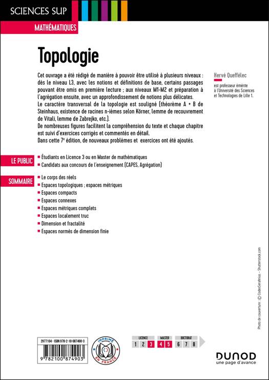 Ce livre présente les notions et définitions de base de la topologie. Dans cette 7eédition, les concepts sont introduits de façon plus progressive pour s'adapter aux besoins des étudiants, des exercices corrigés ont été renouvelés et des conseils méthodologiques d'aide à la résolution des exercices ont été ajoutés.