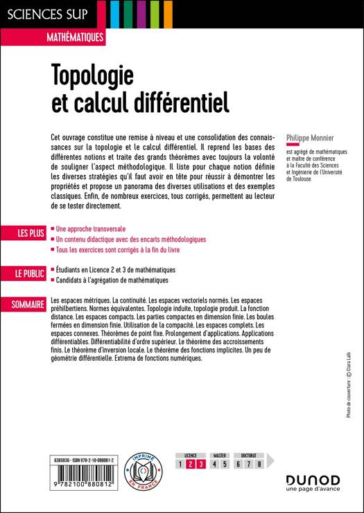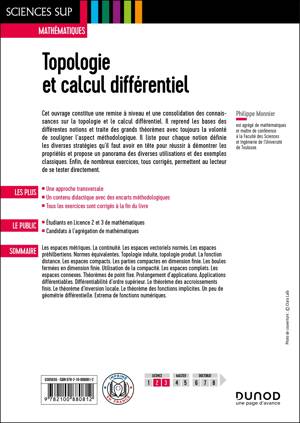 Cet ouvrage constitue une remise à niveau et une consolidation des connaissances sur la topologie et le calcul différentiel. Il reprend les bases des différentes notions et traite des grands théorèmes avec toujours la volonté de souligner l’aspect méthodologique. Il liste pour chaque notion définie les diverses stratégies qu’il faut avoir en tête pour réussir à démontrer les propriétés et propose un panorama des diverses utilisations et des exemples classiques. Enfin, de nombreux exercices, tous corrigés, permettent au lecteur de se tester directement.