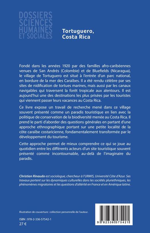 Fondé dans les années 1920 par des familles afro-caribéennes venues de San Andrés (Colombie) et de Bluefields (Nicaragua), le village de Tortuguero est situé à l'entrée d'un parc national, en bordure de la mer des Caraïbes. Il a été rendu célèbre par ses sites de nidification de tortues marines, mais aussi par les canaux navigables qui traversent la forêt tropicale aux alentours. Il est aujourd'hui une des destinations les plus prisées par les touristes qui viennent passer leurs vacances au Costa Rica. Ce livre expose un travail de recherche mené dans ce village souvent présenté comme un paradis touristique en lien avec la politique de conservation de la biodiversité menée au Costa Rica. Il prend le parti d'aborder des questions générales en partant d'une approche ethnographique portant sur une petite localité de la côte caraïbe costaricienne, fondamentalement transformée par le développement du tourisme. Cette approche permet de mieux comprendre ce qui se joue au quotidien entre les différents acteurs d'un site touristique souvent présenté comme incontournable, au-delà de l'imaginaire du paradis.