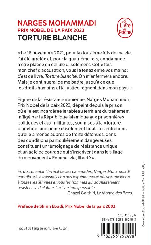 Figure de la résistance iranienne, Narges Mohammadi, Prix Nobel de la paix 2023, dépeint depuis la prison où elle est incarcérée le tableau terrifiant du traitement infligé par la République islamique aux prisonnières politiques et aux militantes, soumises à la « torture blanche », une peine d’isolement total. Les entretiens qu’elle a menés auprès de treize détenues, dans des conditions particulièrement dangereuses, constituent un témoignage de résistance unique et un acte de courage qui s’inscrivent dans le sillage du mouvement « Femme, vie, liberté ».