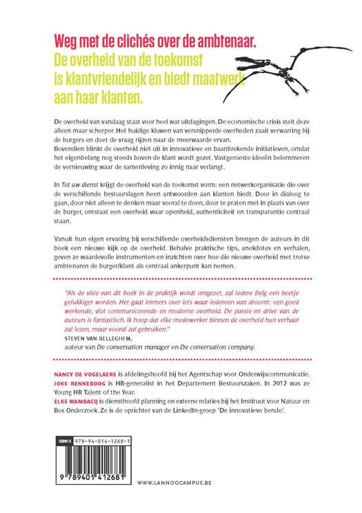 Weg met de clichés over de ambtenaren De overheid van vandaag staat voor heel wat uitdagingen. De economische crisis stelt deze alleen maar scherper. Het huidige kluwen van versnipperde overheden zaait verwarring bij de burgers en doet de vraag rijzen naar de meerwaarde ervan. Bovendien blinkt de overheid niet uit in innovatieve en baanbrekende initiatieven, omdat het eigenbelang nog steeds boven de klant wordt gezet. Vastgeroeste ideeën belemmeren de vernieuwing waar de samenleving zo innig naar verlangt. In Tot uw dienst krijgt de overheid van de toekomst vorm: een netwerkorganisatie die over de verschillende bestuurslagen heen antwoorden aan klanten biedt. Door in dialoog te gaan, door niet alleen te denken maar vooral te doen, door te praten met in plaats van over de burger, ontstaat een overheid waar openheid, authenticiteit en transparantie centraal staan. Vanuit hun eigen ervaring bij verschillende overheidsdiensten brengen de auteurs in dit boek een nieuwe kijk op de overheid. Behalve praktische tips, anekdotes en verhalen, geven ze waardevolle instrumenten en inzichten over hoe die nieuwe overheid met trotse ambtenaren de burger/klant als centraal ankerpunt kan nemen.