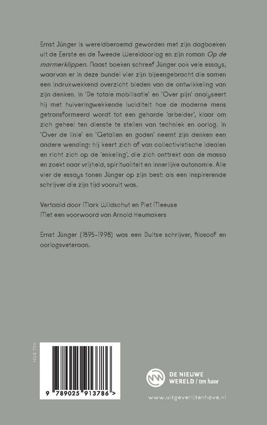 Ernst Jünger is wereldberoemd geworden met zijn dagboeken uit de Eerste en de Tweede Wereldoorlog en zijn anti-totalitaire roman Op de marmerklippen. Minder bekend is dat hij, naast vele boeken, ook essays heeft geschreven. Deze teksten zijn visionaire pogingen om de moderne tijd met zijn raadsels en verschrikkingen diepgaand te peilen.