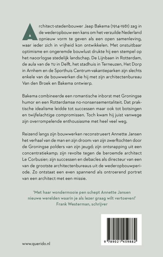 Of je nu in Zeeland bent of in Leeuwarden, Hengelo, Rotterdam, Delft, Arnhem, Nijmegen, Tilburg of Eindhoven: je struikelt over zijn bouwwerken. Miljoenen Nederlanders hebben zelfs wel eens in zijn ontwerp geslapen, toen ze in een vakantiepark van het voormalige Sporthuis Centrum verbleven. Toch kent vrijwel niemand het verhaal van de Groningse arbeiderszoon die zich opwerkte tot directeur van het Rotterdamse architectenbureau Van den Broek en Bakema, dat na de oorlog in het hele land woonwijken, winkelcentra, bedrijfspanden, gemeentehuizen, bibliotheken en bungalowparken bouwde.