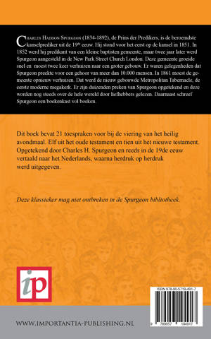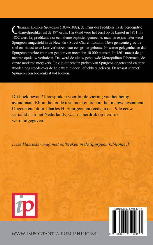 Dit boek bevat 21 toespraken voor bij de viering van het heilig avondmaal. Elf uit het oude testament en tien uit het nieuwe testament. Opgetekend door Charles H. Spurgeon en reeds in de 19de eeuw vertaald naar het Nederlands, waarna herdruk op herdruk werd uitgegeven.